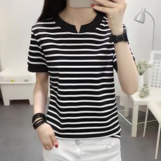 데일로엔 여성 슬릿넥 포인트 심플 스트라이프 반팔티