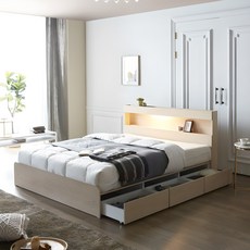[삼익가구]러버 LED 4단 수납 원목 침대(YS 파워 본넬스프링 매트리스-퀸), 내추럴